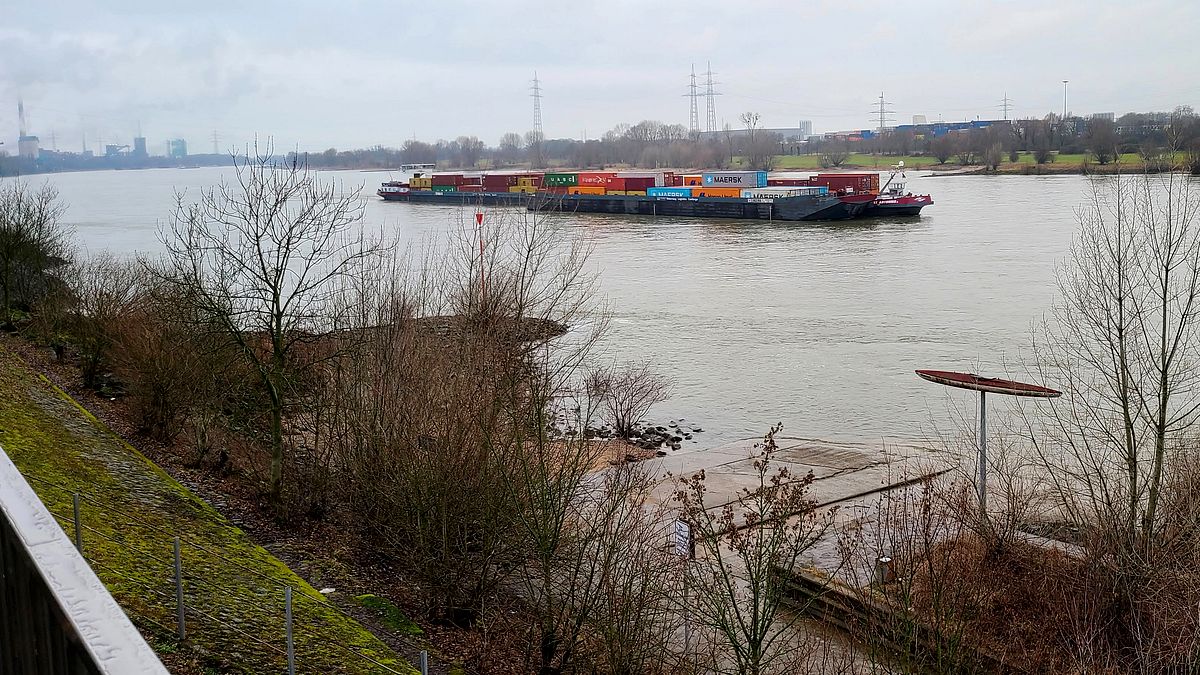 So. 8.2.26 12:00 Und dann war da wieder so ein "Kartontransporter" auf Rhein. Manchmal sind die ja sogar, wie hier, doppelt breit. Hat eigentlich schon mal jemand gezählt, wieviele Container so auf einmal reisen?